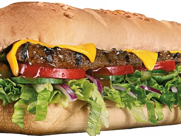 Receita Exclusiva: Steak de carne bovina com sabor churrasco, com pão a sua escolha, alface, tomate, queijo cheddar, e maionese verde. Apenas um item promocional por pedido. Campanha válida somente em dias e horários promocionais, ou até a duração dos estoques. Imagem ilustrativa.